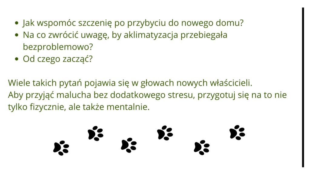 Przeprowadzka szczenięcia to niewątpliwie nowa i nieoczekiwana zmiana dla malucha. To także nowa sytuacja dla właścicieli, gdyż w domu pojawia się maleństwo, które wymaga zaopiekowania się i odpowiedniego wprowadzenia w nowe środowisko. To czas stresujący dla naszego czworonożnego przyjaciela, gdyż jego dotychczasowe otoczenie diametralnie się zmienia. Opuszcza hodowlę, w której miał kontakt z matką oraz rodzeństwem. Teraz pojawił się w nowym środowisku, wśród nieznanych zapachów i osób.